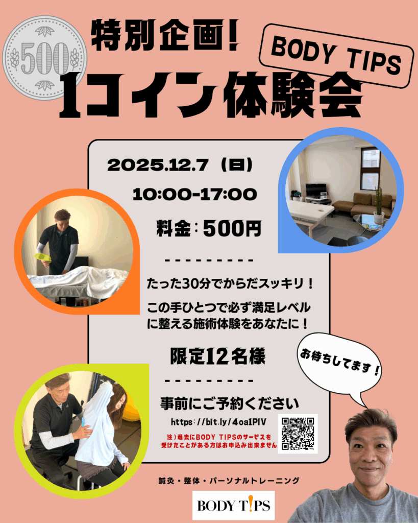 初開催!BODY TIPSの人気の施術が1コイン500円で体験できる特別企画を発表しました。