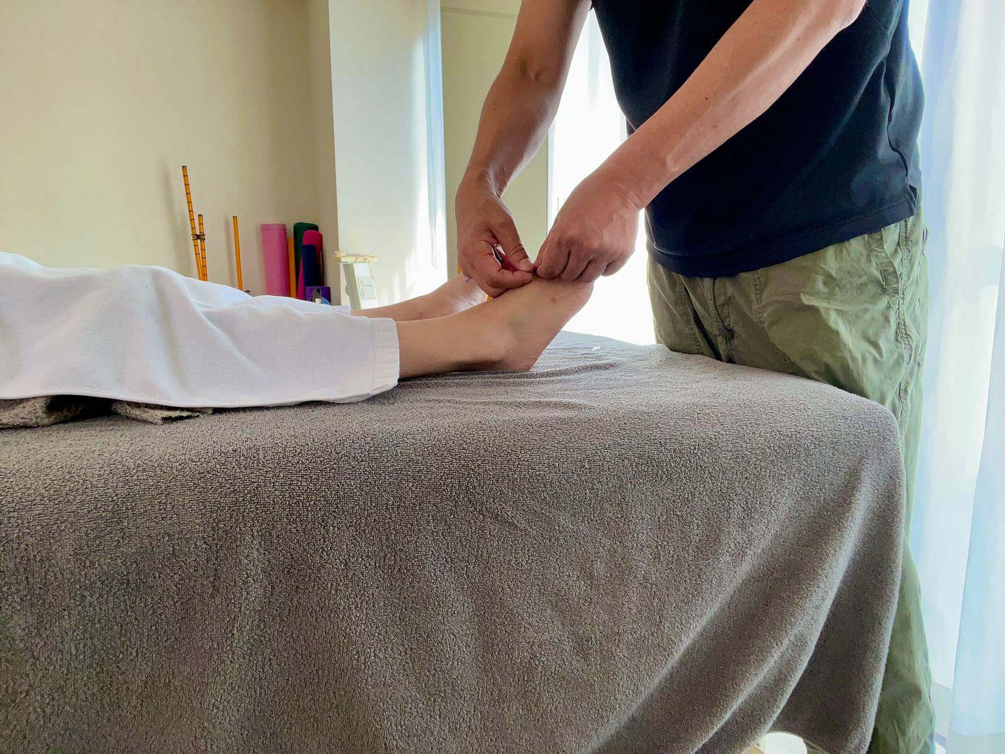 経絡の気の流れを整えることに主眼を置き、必要に応じて筋膜の癒着などに対してストレッチで動かします。